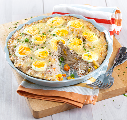 5-Deite a mistura de massa e legumes para um tabuleiro de louça e espalhe por cima o preparado de atum.