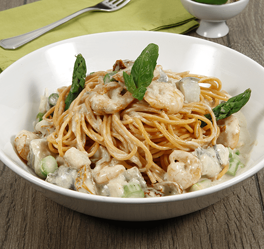Esparguete com bacalhau e camarão